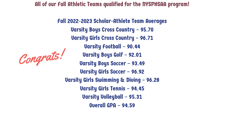 New Paltz High School is very proud to commemorate the commitment and excellence of our athletes, both on and off the field. Through hours of practices a week, competitive games and competitions, and balancing the complications of school, our student-athletes have maintained an average GPA of 94.59, qualifying all teams so far for the NYSPHSAA program!